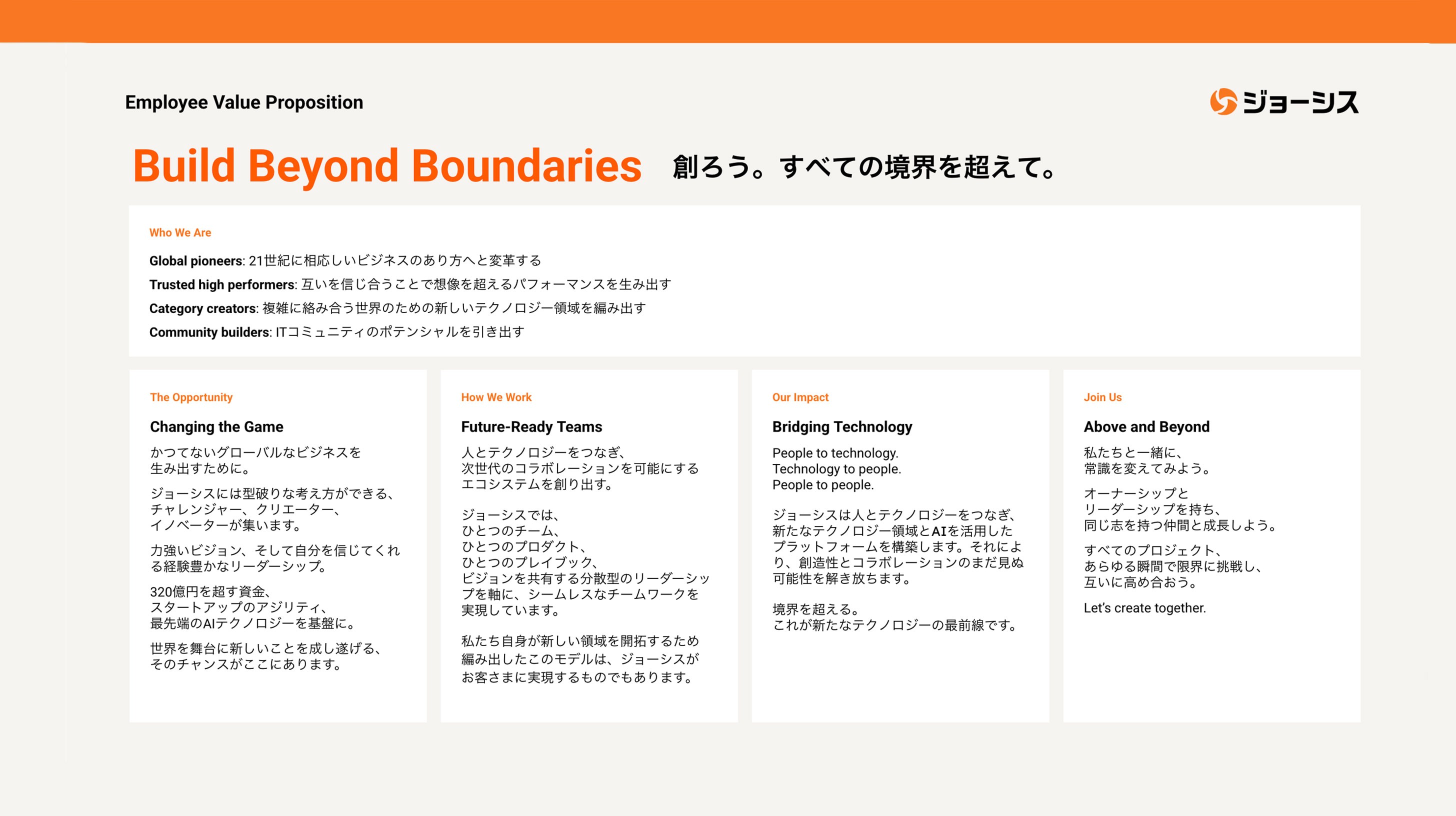 a uniquely flat, decentralised org structure where teams from Japan, India, Singapore, the United States, Vietnam and beyond operate under the motto "One Team, One Product" with shared ownership. To support their rapidly expanding business and organisation, Josys sought to develop a unifying employer brand narrative that could be used in every one of their hubs globally, at every level of recruitment that expressed the vision and is true to the employee experience.
