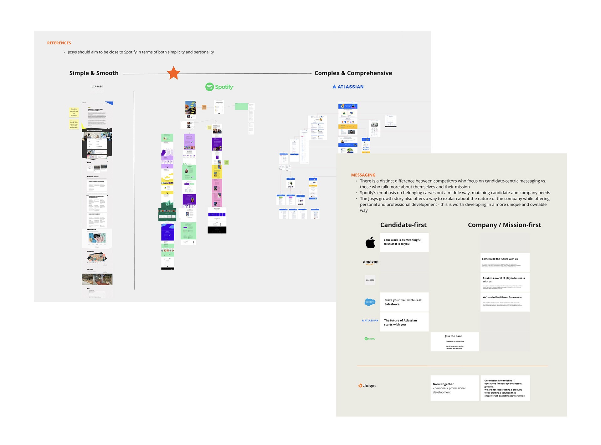 Fabric's first step was to analyse recruitment narratives of global tech companies and startups, as well as Josys' existing recruitment messaging. By comparing the characteristics and narrative structures of other companies against their own, and analysing strengths and weaknesses, we were able to reach team consensus on how Josys needs to compete as an employer brand across geographies and career verticals.