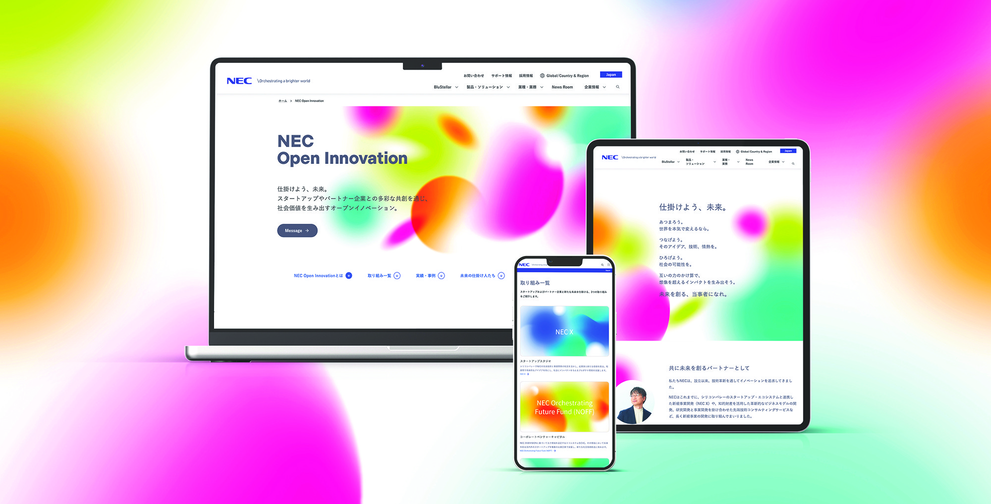 Fabric was responsible for content planning and design of the website that serves as the foundation for communicating "NEC Open Innovation” — the new umbrella term for NEC's new business development initiatives. Based on the visual design developed for the website, we created other assets including booklets, T-shirts, PowerPoint templates, and Zoom background images.