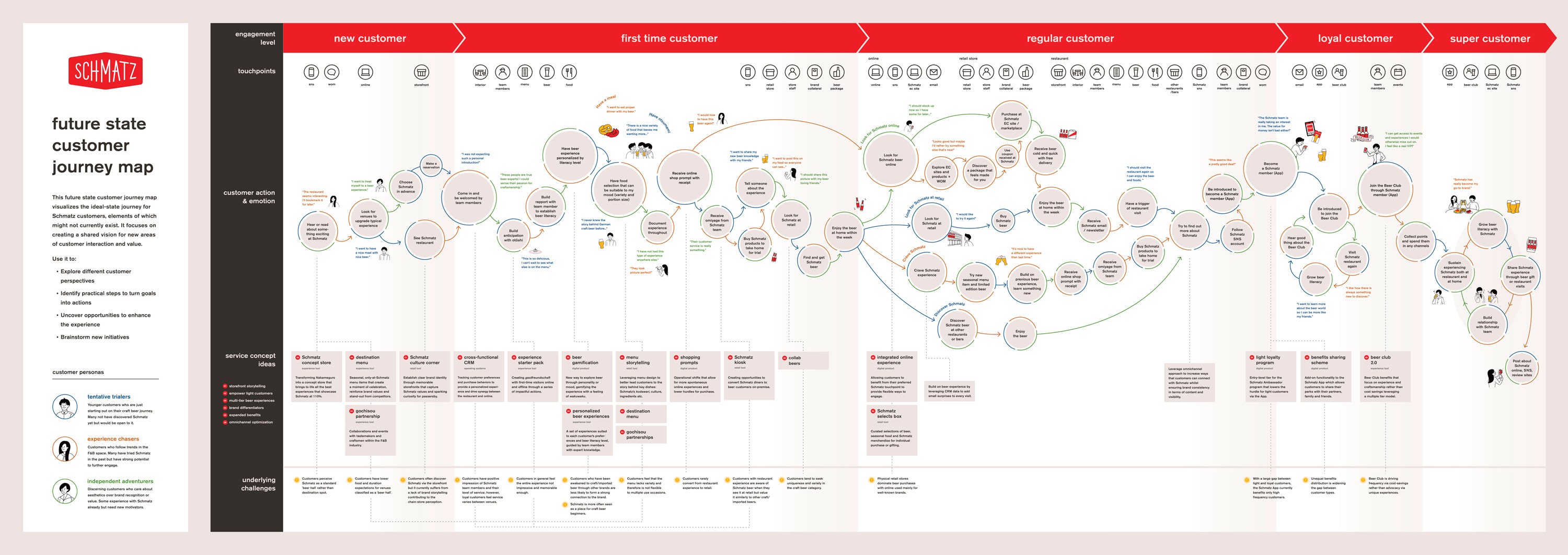 After identifying target customer personas who have the greatest potential to engage with Schmatz, we designed a future state journey map as a tool that envisions the ideal customer experience for each persona facilitated by service concepts. With the future state journey map, pain points were turned into new gain points, while existing gain points were further leveraged to be even more beneficial to experience.