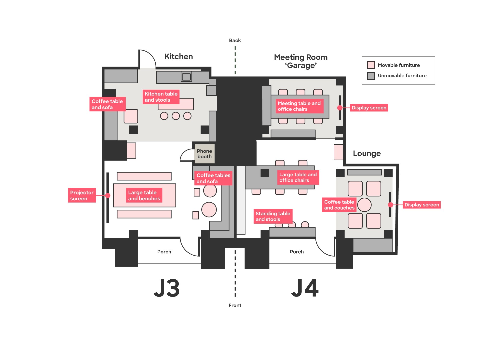 Surrounded by trendy boutiques and cafés, the space offers convenient street-level access with both front and back entrances and is just a 7-minute walk from the station. J3 has an open, communal feel, with large movable furniture and art gallery-grade movable exhibition walls. An open kitchen fully stocked with utensils and tableware makes food-centred gatherings easy. In contrast, J4 offers a more structured atmosphere, featuring a small stage ideal for fireside chats, as well as a rear meeting space suited to more private meetings.